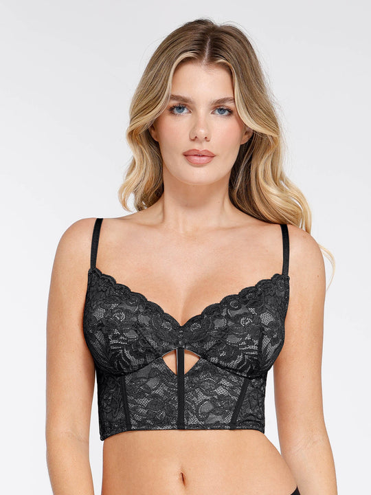 Integrated underwire shapes and supports the bust, featuring a center cutout design and beautiful lace fabric for an elegant and seductive appeal.